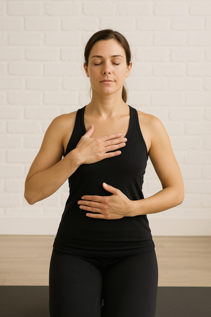 胸に手を当て、息を吸って肋骨を横に広げる。吐くときに胸が閉じるように。