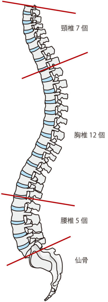 背骨(脊柱)は「頚椎 → 胸椎 → 腰椎 → 仙椎 → 尾椎」と連なり、部位ごとに役割が異なります。それぞれがバランスよく動くことで、背骨全体の安定性と可動性の調和が保たれています。