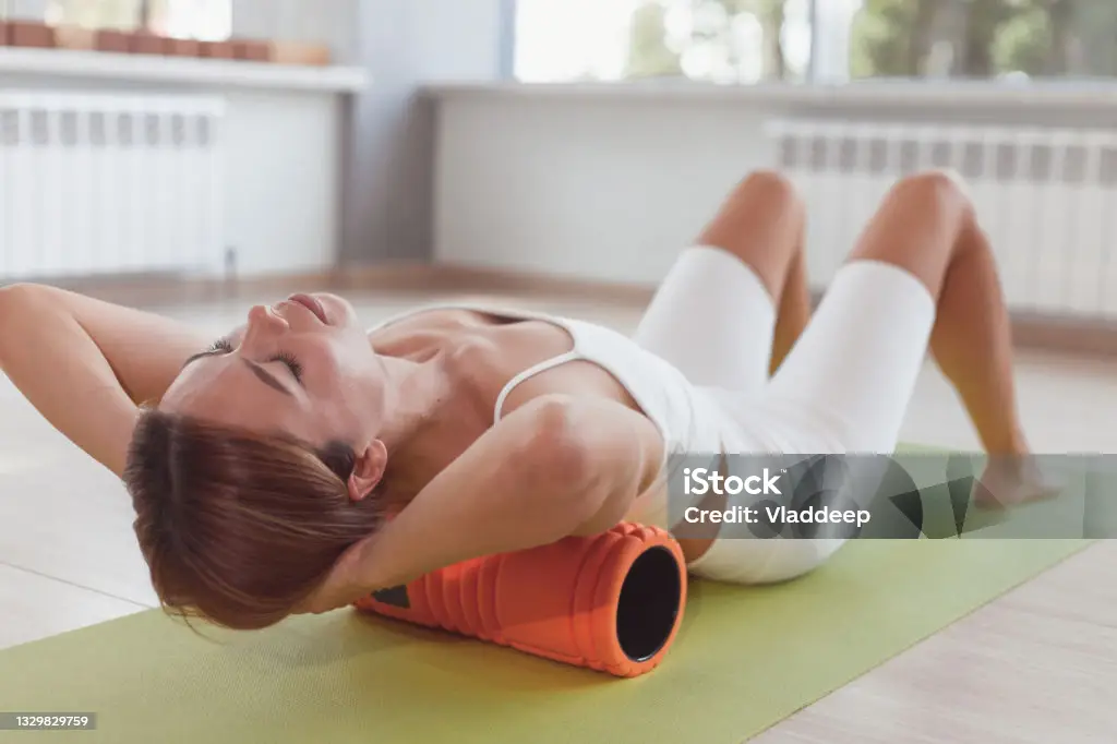 背中の真ん中にローラーを当てて仰向けに寝る。息を吐きながら胸を開くように背中を反らす。